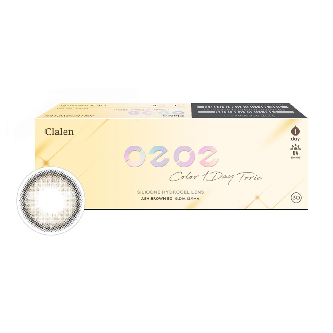 Enhance your vision with Clalen O2O2 Color 1-Day Toric Ash Brown EX. These 30-pack daily disposables correct astigmatism with a toric stabilization design, feature a 12.9 mm colored diameter and layered ash brown tones for subtle enlargement, plus breathable silicone hydrogel (45% water, 130 Dk/t) and UV blocking.