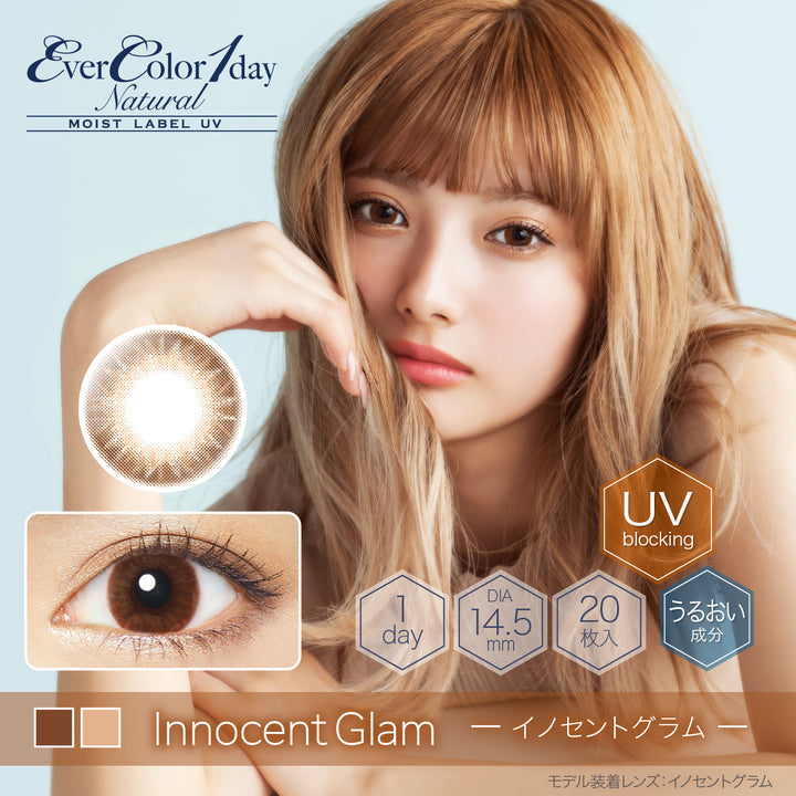 Innocent Glam delivers a luminous brown look: a warm caramel base fades into a soft beige/gold center, with a gentle limbal ring and micro-dot blend for natural depth and a subtle 13.8 mm enlargement.