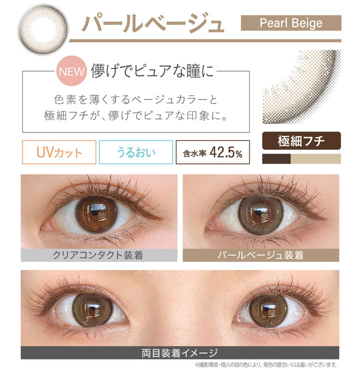 Ultrafine dark ring with ash-beige tone-up color for a pure, “teary” glow. A 13.8 mm color area and fine dots add sheer, natural depth.