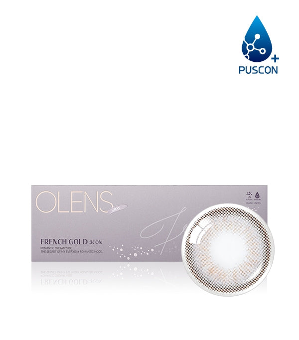 The OLENS 1 Day French Gold 3con Gray lenses deliver understated elegance through thoughtful design. The 13.1 mm graphic diameter stays close to the natural pupil size and adds a delicate, believable enhancement rather than an exaggerated look. A creamy edge line softly defines the iris and introduces a gentle glow without harsh contrast. Made from PUSCON with 48% water content, these daily disposables fuse comfort with style. The design’s muted gray palette layers gracefully over your natural eye color, creating a chic, sophisticated look that remains naturally seamless.