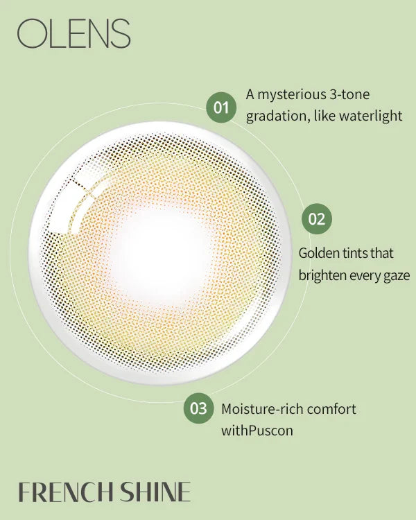 OLENS French Shine Olive uses a gold-tinted, 3-tone gradation pattern to create a soft “waterlight” glow that looks bright but still natural. The 13.2mm graphic diameter keeps definition crisp while maintaining an everyday, elegant olive finish.