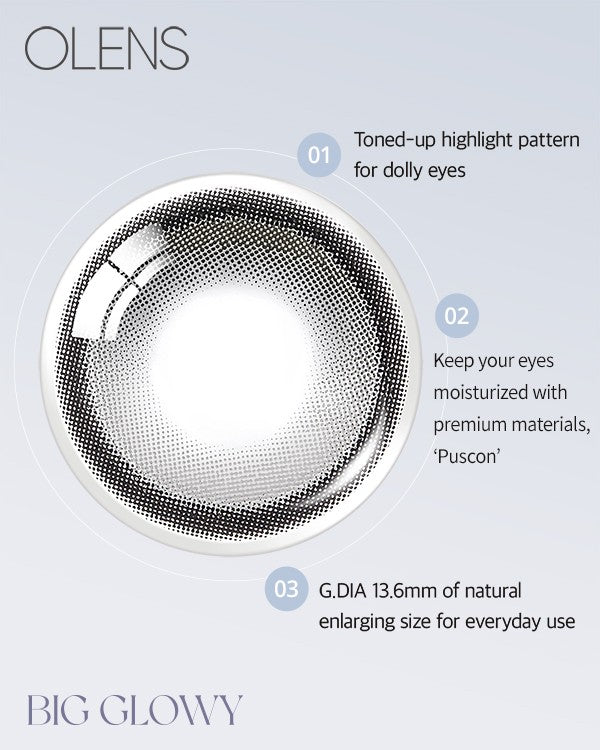 Cool gray with a bold outer ring and highlight “glow” pattern adds bright, doll-like dimension. The 13.6 mm graphic delivers big, standout enlargement.