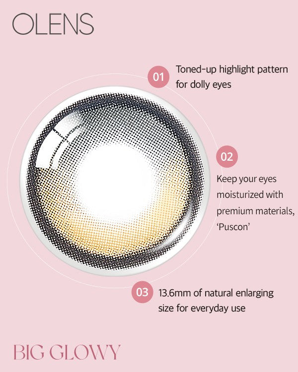 Warm mocha brown with a bold outer ring and glowy highlight pattern adds bright, doll-like dimension. The 13.6 mm graphic delivers big, standout enlargement.