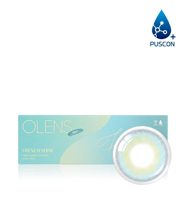 OLENS 1-Day French Shine Aqua lenses fuse advanced PUSCON hydrogel and 48% hydration with a luminous gold-tinted aqua gradation, precise dimensions for natural enlargement, a daily disposable 10 pack format, and a broad prescription range for radiant, comfortable wear.