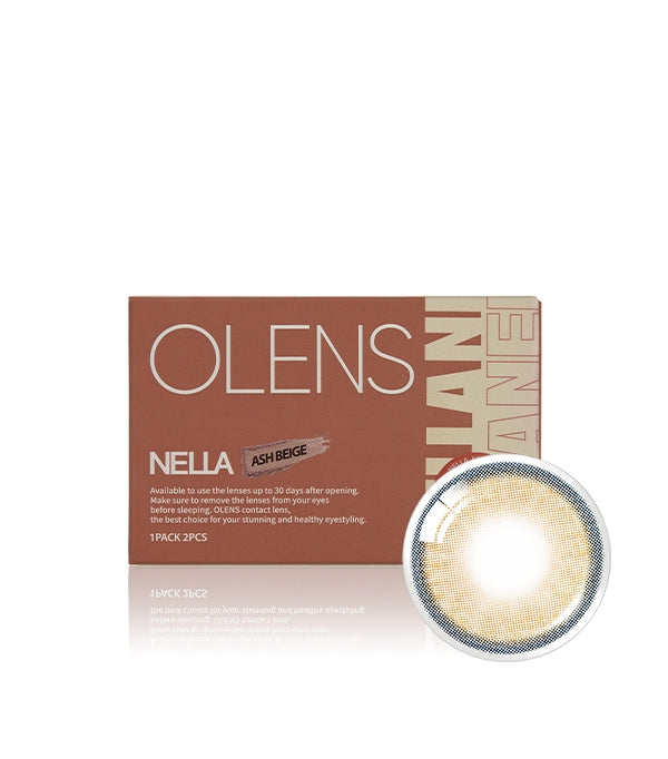 Nella Ash Beige lenses feature a soft ash-beige radial gradient framed by a subtle limbal ring for natural depth, with a perfectly balanced 13.3 mm graphic diameter that gently enlarges the iris in an effortlessly elegant way.