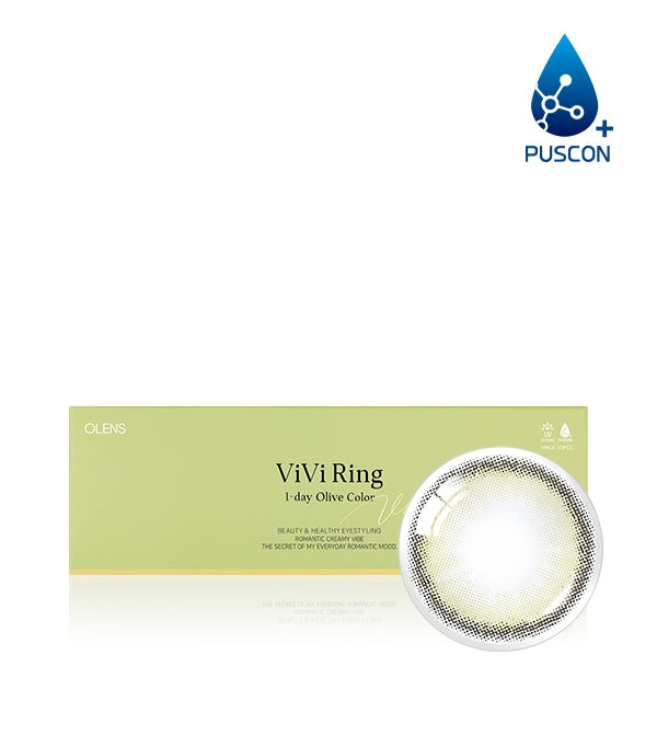 OLENS ViVi Ring 1 Day Olive daily disposables (10-pack) feature a creamy olive-tone ring design with a 13.0 mm graphic diameter and 14.2 mm total diameter for subtle eye enlargement. Made from premium Puscon® material with 48% water content and an 8.7 base curve, they lock in moisture and ensure all-day comfort.