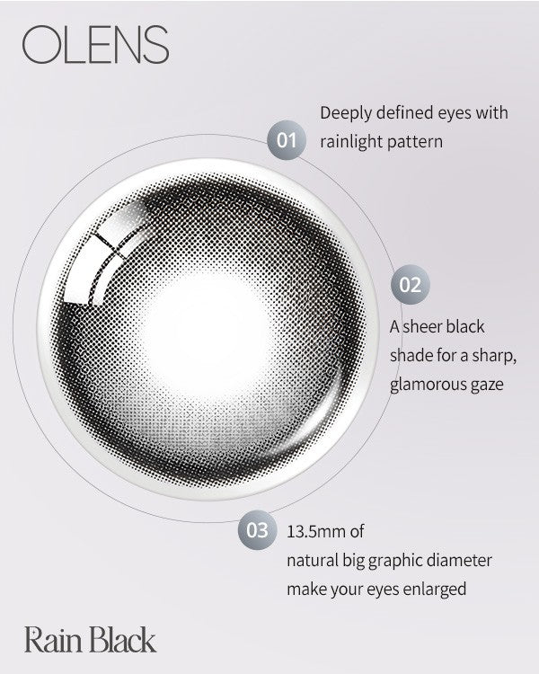 Sheer black with a rainlight highlight pattern adds clear, watery shine while keeping the gaze deeply defined. The 13.5 mm graphic gives naturally bigger-looking eyes.